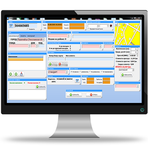Диспетчерська програма – це головний програмний модуль, що дозволяє (в залежності від рівня доступу) здійснювати управління замовленнями, водіями, диспетчерами, налаштовувати поведінку системи і генерувати різні звіти. Також в диспетчерську програму вбудовані модуль карти і програмний телефон. Перший з них, дає вам можливість змінювати карти і об’єктами на карті, здійснювати попер. прорахунок вартості проїзду, в автоматичному режимі шукати найближчу машину на замовлення (не використовуючи сторонні картографічні системи). Другий – взаємодіяти з IP-телефонією, прийом дзвінків не посередньо програмним телефоном вбудованим в диспетчерську програму, через адміністративну панель прослуховувати записи розмов з клієнтами і розподіляти дзвінки між операторами